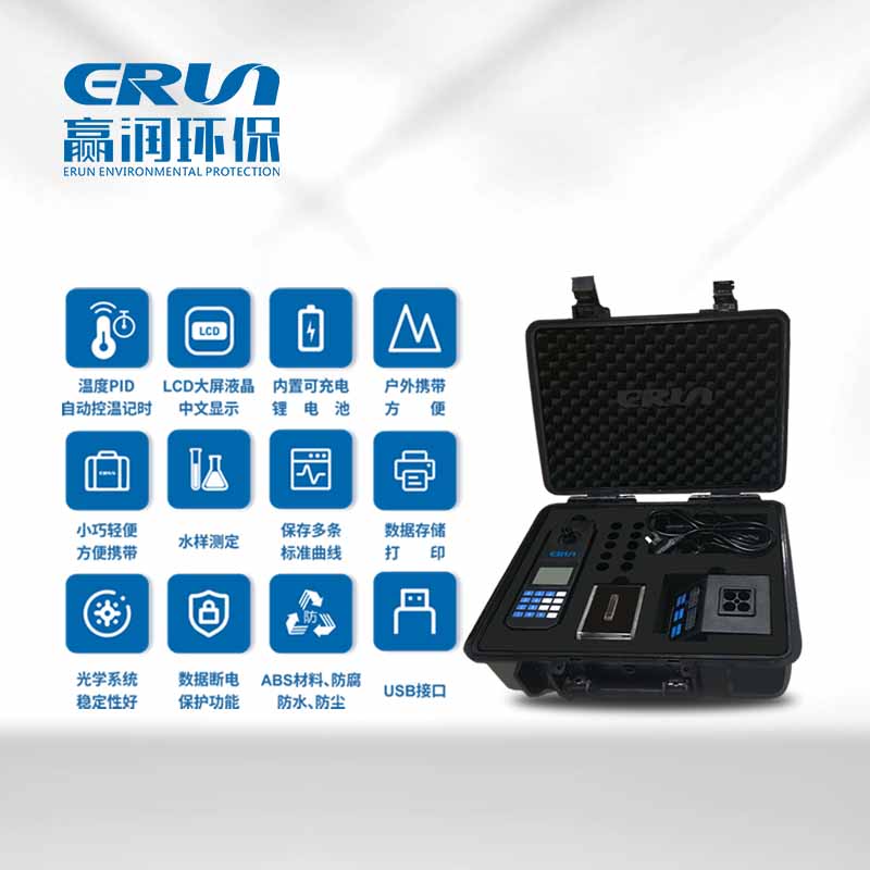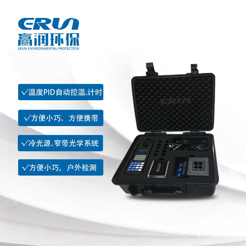 贏潤環保研發、生產的便攜式多參數COD、總磷、總氮水質測定儀ERUN-SP-830B采用冷光源、窄帶干涉光學系統,光學性能穩定,具有PID自動控溫、計時等功能,操作簡便、省時,USB端口可連電腦讀取或快速打印數據。